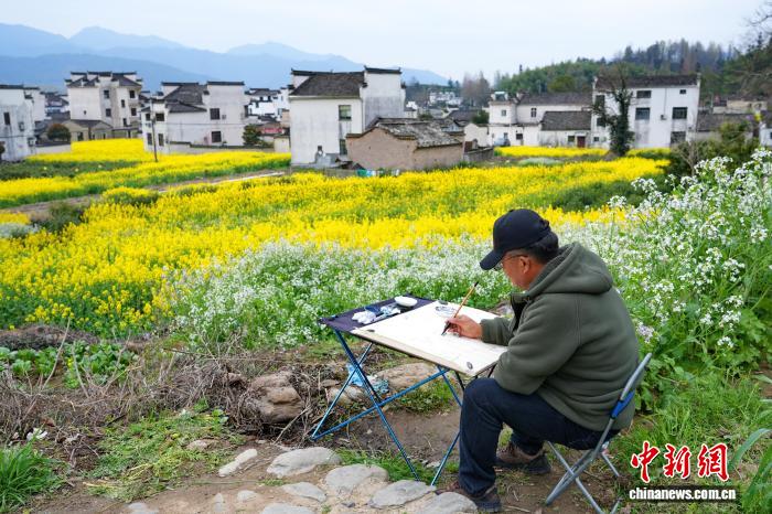 3月26日,40位好术家正在安徽省黄山市黟县卢村油菜花田间写死独创,用绘笔定格秋日好景。许家栋 摄