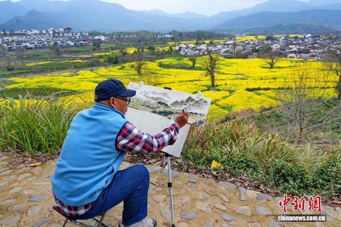 3月26日,40位好术家正在安徽省黄山市黟县卢村油菜花田间写死独创,用绘笔定格秋日好景。许家栋 摄